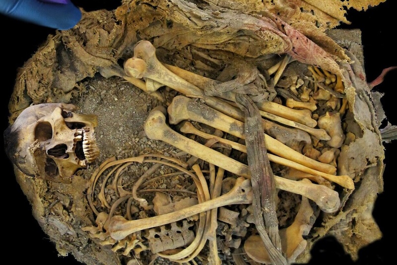 Hna Hnu’nun kalıntılarının açıldığı an. Bu kalıntıların yaklaşık 1.000 yıl boyunca korunmasına olanak tanıyan, kuru bir ortamdı. Araştırmacılar, kalıntılardan bir koprolit ve bağırsak dokusu izole ederek, Hna Hnu’nun yaşadığı dönemde hala mevcut olan bakterilerin DNA’sını çıkarmayı başardılar. C: Rosas-Plaza et al. 2025.