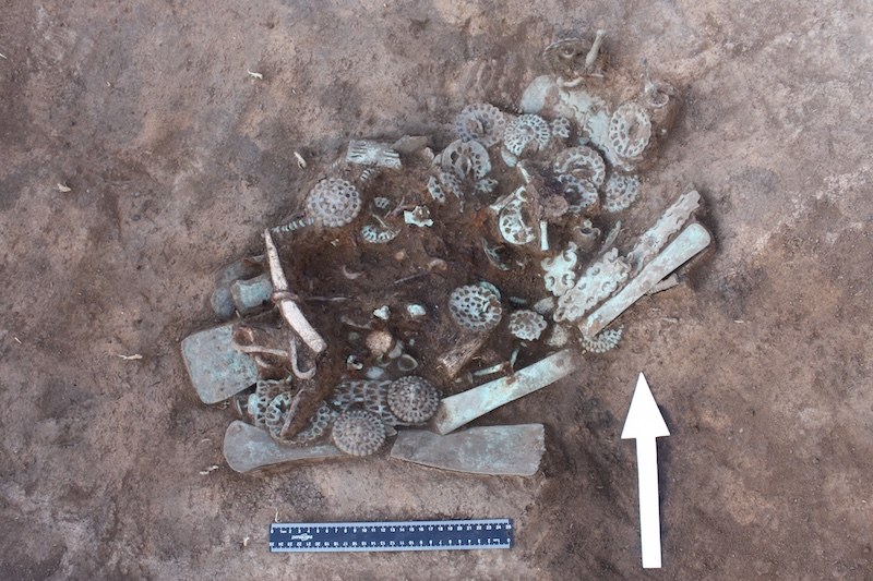 Rusya’da iki tümülüs arasında keşfedilen benzersiz bir “kurban kompleksi”, Güney Ural Dağları’nda yaklaşık 2.400 yıl önce yaşamış göçebe toplulukların ölü gömme ritüelleri hakkında yeni bilgiler sunuyor. Bu kurban kompleksinde bulunan yüzlerce nesne arasında, en az bir düzine antik at koşum takımı setini temsil eden bronz alınlıklar, yanaklık parçaları ve demir gemler yer alıyor. Koşum takımları, düz, yuvarlak metal disklerle süslenmişti. Bu disklerin bazıları kuşları ve mitolojik hayvanları tasvir ederken, bazıları geometrik desenler ya da insan yüzleri taşıyordu. Kurban kompleksi ayrıca, hayvan motifli gümüş kaplamalara sahip ahşap bir kâse ile kurban hayvanı olarak yerleştirilmiş yaban domuzu çenelerini de içeriyordu. Arkeologlar, gümüş kaplamalı ahşap kâse ile yaban domuzu çenelerinin, bu kurban kompleksinin bir cenaze ritüelinin parçası olduğunu düşündürdüğünü belirtiyor. Mezardan sonraki ritüel faaliyetler muhtemelen iki tümülüs arasındaki alanda göçebe soylular tarafından gerçekleştirilmişti.