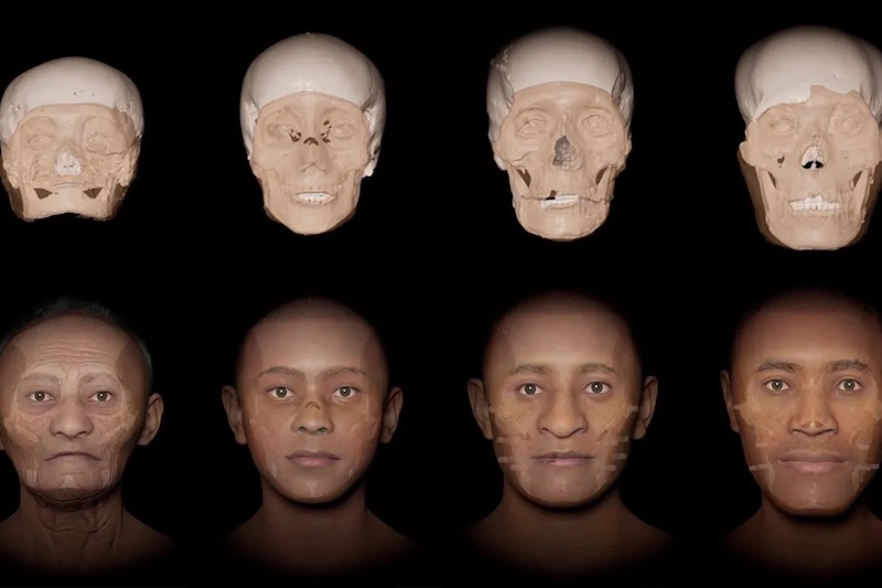 Yeniden canlandırmalar, yüzlerine sıkıca oturtulmuş maskeler bulunan dört mumyalanmış bireyin kafataslarına dayanıyor.