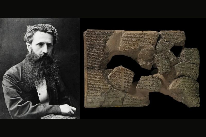 George Smith (1840–1876) ve tufanın öyküsünü ortaya çıkarmak için parçaları bir araya getirdiği tablet. (Görsel: The Trustees of The British Museum)