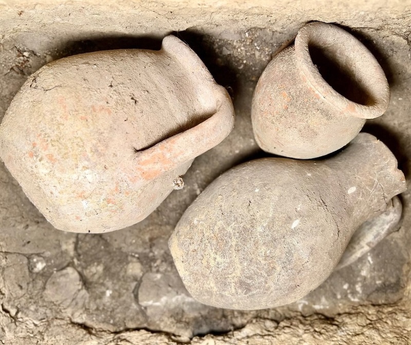 Bunun yerine, iç kısımda üç sağlam terrakotta kap vardı: bir bicchiere (kupa) ve iki brocchette (küçük sürahi), düzenli bir şekilde yerleştirilmişti. Turuncu hamurlu ve sade işçilikli bu kaplarda herhangi bir süsleme yoktu.