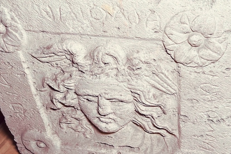 Medusa, kenarları kazıma ile işlenmiş kare bir çerçeve içinde, akıcı ve köşeli hatlara sahip Etrüsk yazıtlarıyla çevrili. Bu özellikler, eseri ailenin hypogeum’unun (yer altı mezarı) başlangıç dönemine, MÖ 3. yüzyıla tarihlendiriyor. Parçanın üzeri, seçkin cenaze eşyalarına özgü çiçek motifleri ve paterae (ritüel diskler) ile süslenmiş.