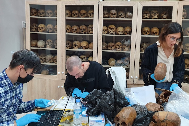 Tiflis Devlet Üniversitesi’ndeki antropolojik koleksiyonda insan kalıntılarından örnekleme. Çalışmanın ortak yazarları olan uluslararası araştırma ekibi, örnekleri Max Planck Evrimsel Antropoloji Enstitüsü’nde antik DNA analizi için inceliyor. C: Shorena Laliashvili