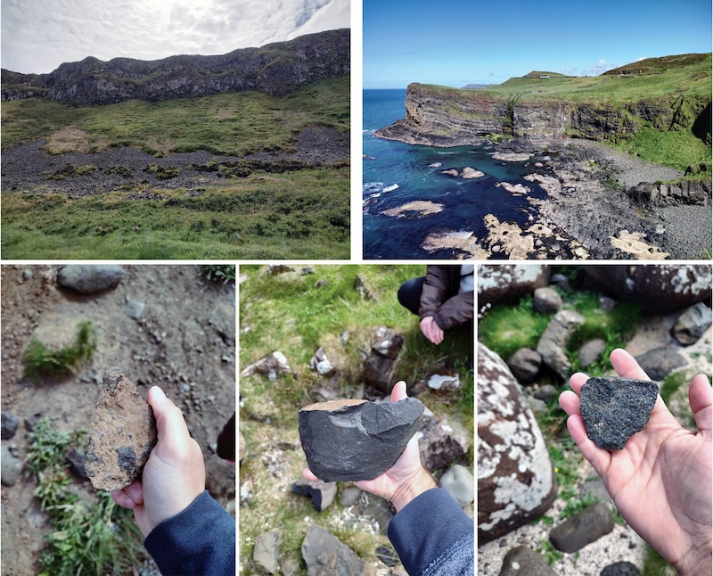 Kuzey İrlanda’daki Giant’s Causeway yakınlarında bulunan, doğal olarak oluşmuş keskin kenarlı bazalt örnekleri (alt sıra). Bu örneklerin, aşağı doğru yuvarlanma süreçleri ve kıyı hareketleri sonucu oluştuğu görülüyor. C: Michelle R. Bebber and Metin I. Eren