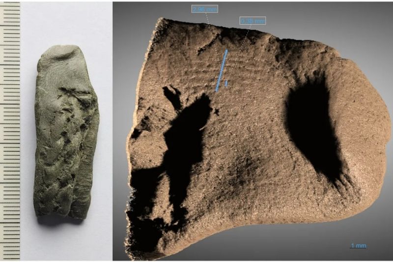 Hjortspring teknesinden alınan ve üzerinde bir parmak izi görülen kalafatlama malzemesi parçası (solda) ile parmak izi bölgesinin yüksek çözünürlüklü X-ışını tomografisi taraması (sağda). (Fotoğraf: Erik Johansson; 3D model: Sahel Ganji; CC BY 4.0)
