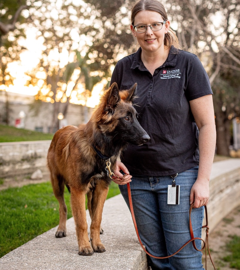 Araştırmacı Lindsay Waldrop ve köpeği. Bulgular, seçici yetiştirmenin performans uzmanlaşmasına yol açtığına dair geleneksel varsayımlara meydan okuyor. C: Worden Photography for Chapman University