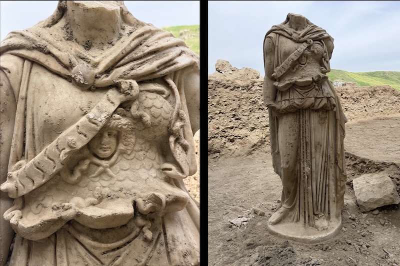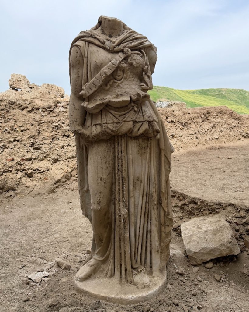 Denizli’deki Laodikeia Antik Kenti’nin Batı Tiyatrosu sahne binasında yürütülen kazılarda, Augustus dönemine ait (MÖ 27 ila MS 14) beyaz mermerden yapılmış yaklaşık iki metrelik bir Athena heykeli gün yüzüne çıkarıldı.