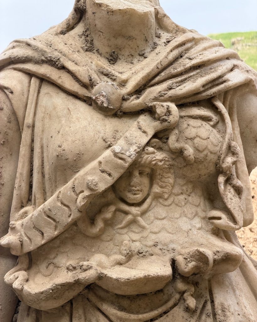 Heykel, sahne binasının dış duvarındaki moloz dolgu içinde yüzüstü halde bulundu. Baş kısmı henüz tespit edilememiş olsa da eserin ayrıntıları dikkat çekici. İnce dokulu kolsuz peplos, boyunda pelerin (hylamis) ve göğüste Medusa başı ile yılanları barındıran aegis dikkat çekiyor.