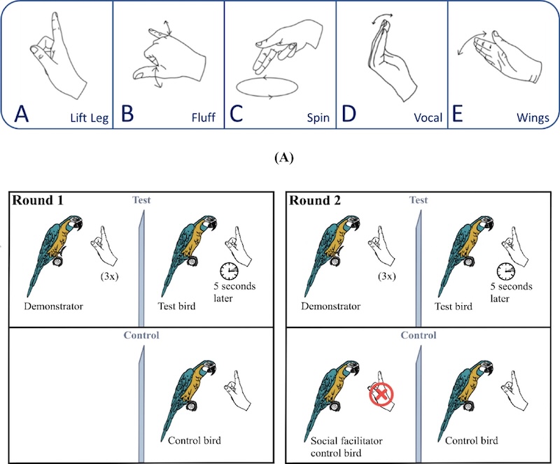 Makavların üçüncü taraf taklidi yoluyla öğrenip öğrenemeyeceğini test etmek için araştırmacılar iki grup kuşla çalıştı ve 4.600’den fazla deneme yaptı. Deney grubundaki kuşlar, başka bir makavın bir insanın el sinyallerine karşılık verdiği beş farklı hedef davranıştan birini gerçekleştirdiğini izledi. Bu davranışlar şunlardı: tüylerini kabartma, vücudunu döndürme, ses çıkarma, bir ayağını kaldırma veya kanatlarını çırpma. Kontrol grubundaki makavlara ise aynı el sinyalleri verildi ama hiçbir zaman başka bir kuşun bu davranışları yaptığı gösterilmedi.
