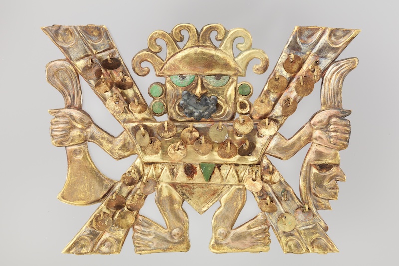 Kuzey Peru’daki Loma Negra arkeolojik alanında bulunan bu yaldızlı bakır burun süsü, “Baş Kesici” (İngilizce Decapitator) diye anılan önemli Moche tanrısı Ai Apaec’i tasvir ediyor. Süs üzerinde, göz bebekleri için turkuaz ve siyah taş kakmalar yer alıyor.