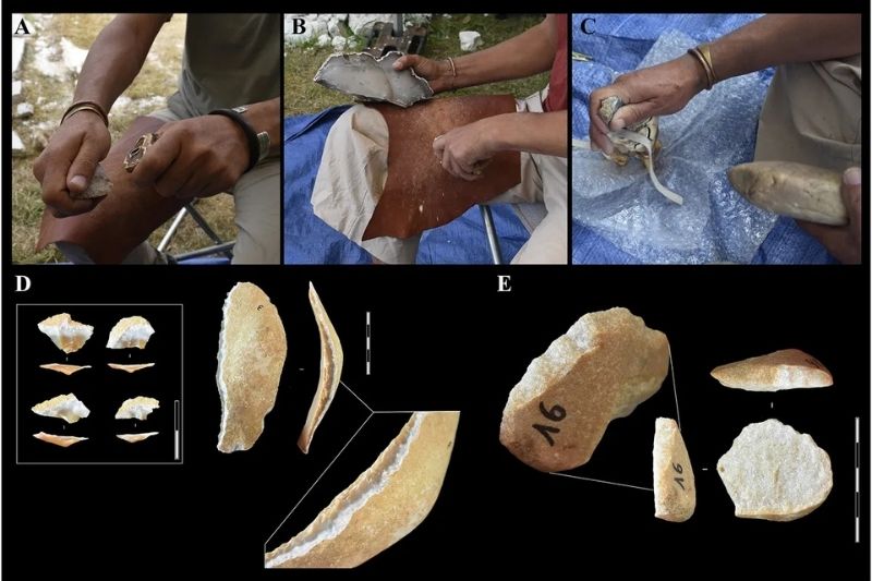 Yürütülen taş yontma deneyleri, gergedan dişlerinin gerçekten birer alet olarak kullanıldığını doğruladı. C: Sanz-Royo vd. 2026