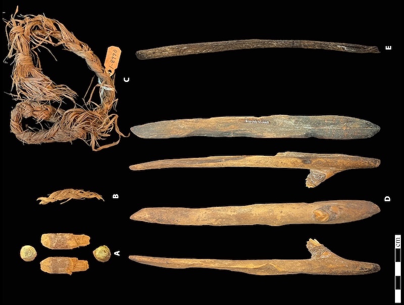 Mağaralardan seçilmiş ahşap ve lif eserler. C: Rosencrance et al. 2026.