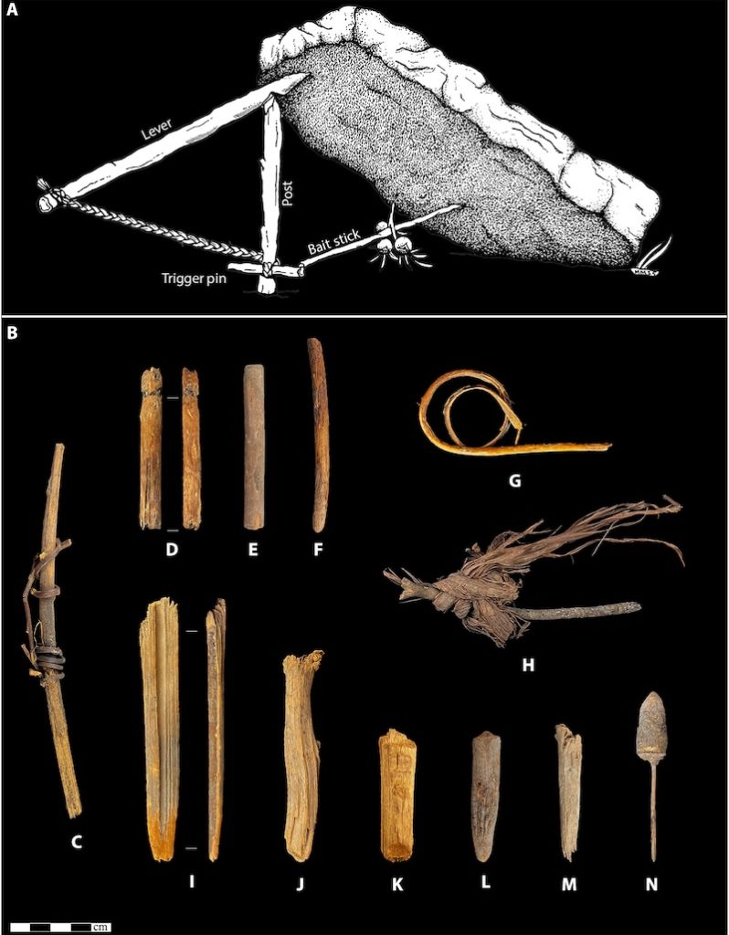 Alanda bulunan diğer organik buluntuların yanı sıra, 1960’lardaki ilk kazılarda ahşap nesneler de rapor etmişti. Ancak bunların bazılarının kaybolmuş olabileceği anlaşılıyor. Ekip, günümüze ulaşan üç örneği, küçük hayvanları yakalamak için kullanılan düşme tuzaklarının olası tetik mekanizmaları olarak yorumluyor.