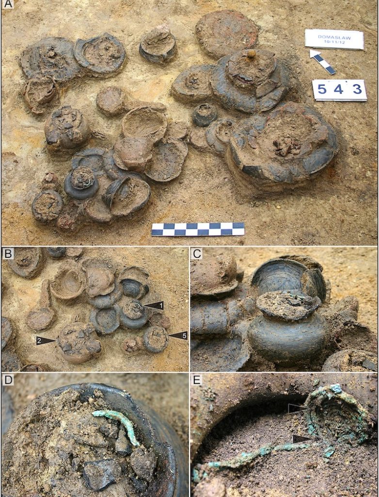 Kremasyon mezar, Hallstatt dönemine (yaklaşık MÖ 850 ila 400) tarihlenen Lusatian Urnfield kültürüne ait bir nekropolde bulunan 800 mezardan biriydi.