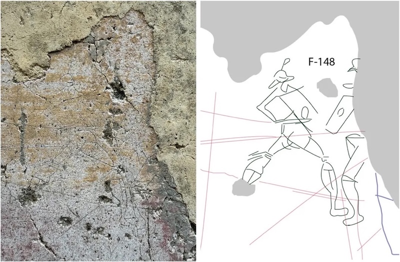 Yeni tespit edilen bir başka grafiti de, her biri yaklaşık 10 santimetre boyunda iki gladyatör çizimi. Çalışmaya göre, kılıç ve kalkan tutan figürlerden biri geriye doğru yaslanıyor; belki bir aldatmaca hamlesini ya da bir savunmayı temsil etmek için. Diğeri yalnızca kısmen görünüyor; fakat benzer silahlar kullandığı anlaşılıyor.