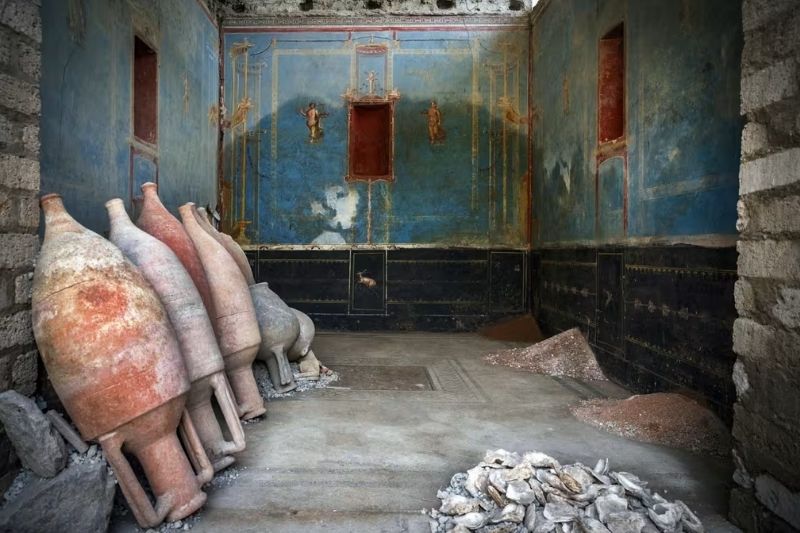 Nitekim arkeologlar; doğu duvarına yaslanmış on beş taşıma amforası, üç yığın inşaat malzemesi (seramik kırıkları, kireç ve volkanik kül) ve işlevi henüz tam olarak çözülememiş bir istiridye kabuğu yığınına rastladılar. Görünüşte gündelik ve işlevsel olan tüm bu nesneler, Pompeii’deki özel konutlarda bugüne kadar saptanmış en lüks duvar dekorasyonlarından biriyle aynı mekânda yan yana bulunuyordu.
