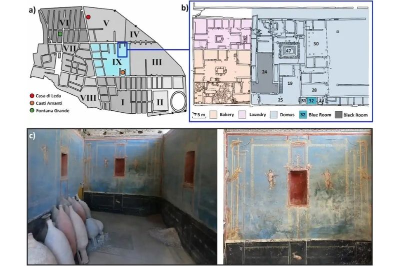 Teknik adıyla insula IX.10’un 32 numaralı alanı olan Mavi Oda, göründüğünden çok daha fazlasını barındırıyor. 2024 yazında kazı çalışmaları tümüyle tamamlanan bu mekân, bir sacrarium, yani ev içi kutsal alan olarak tanımlanıyor. Merkezi avluya açılan süslemeli bir vestibülümden (giriş holü) geçilerek ulaşılan odanın, stratigrafik analizlere göre MS 79’daki Vezüv patlaması sırasında depo işlevi görüyor olması ise tabloya ilginç bir boyut katıyor.