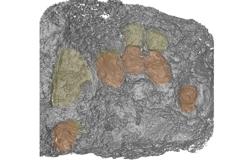 Alçının 3B taraması, parmak izlerini (turuncu) ve parmak sürükleme izlerini (sarı) ortaya koyuyor. C: Seeing the Dead Project / University of York ve York Museums Trust