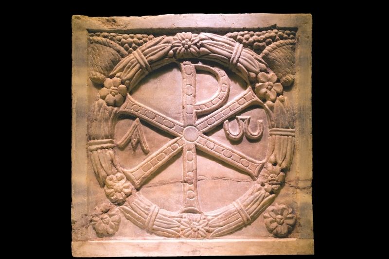 Vatikan Müzesi’nde sergilenen MS 4. yüzyıl tarihli mermer bir lahit üzerindeki Chi-Rho monogramı. (Görsel: Wikimedia Commons)
