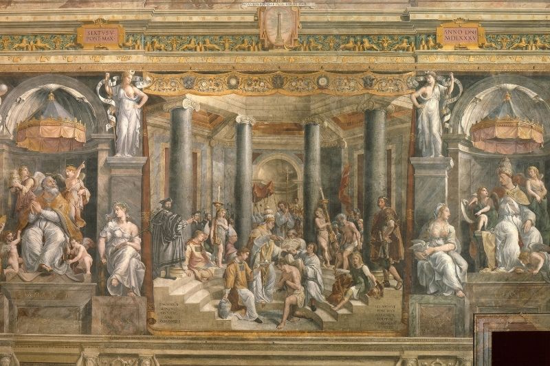 Gianfrancesco Penni’nin 1517-1524 tarihli “Konstantin’in Vaftizi” freski, Vatikan’daki Apostolik Sarayı’nda bulunuyor. Popüler efsaneye göre Papa I. Sylvester, Konstantin’i uzun süre muzdarip olduğu ve tarihçilerce cüzzam olduğu düşünülen bir hastalıktan kurtarmış, hemen ardından da onu vaftiz etmişti. (Görsel: Wikimedia Commons)