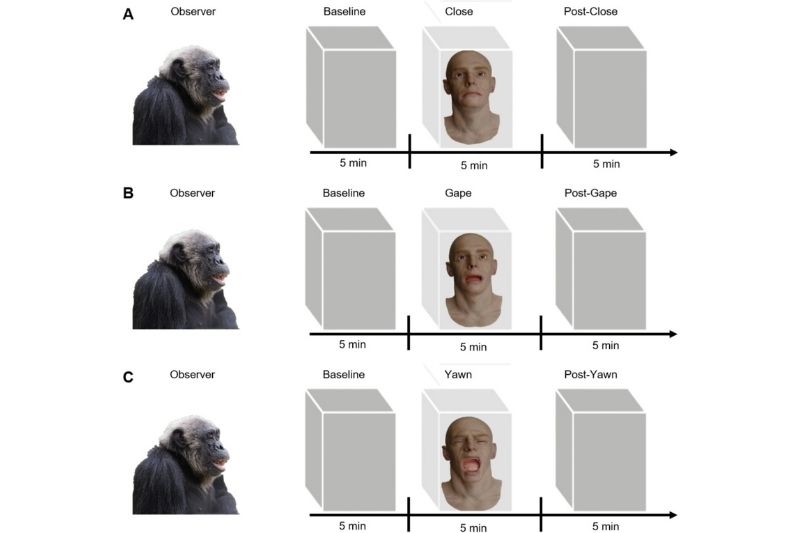 Londra Üniversitesi tarafından yürütülen yeni bir araştırma, şempanzelerin (Pan troglodytes) insan yüz ifadelerini taklit eden bir androidden esneme “kapabildiğini” ortaya koydu.