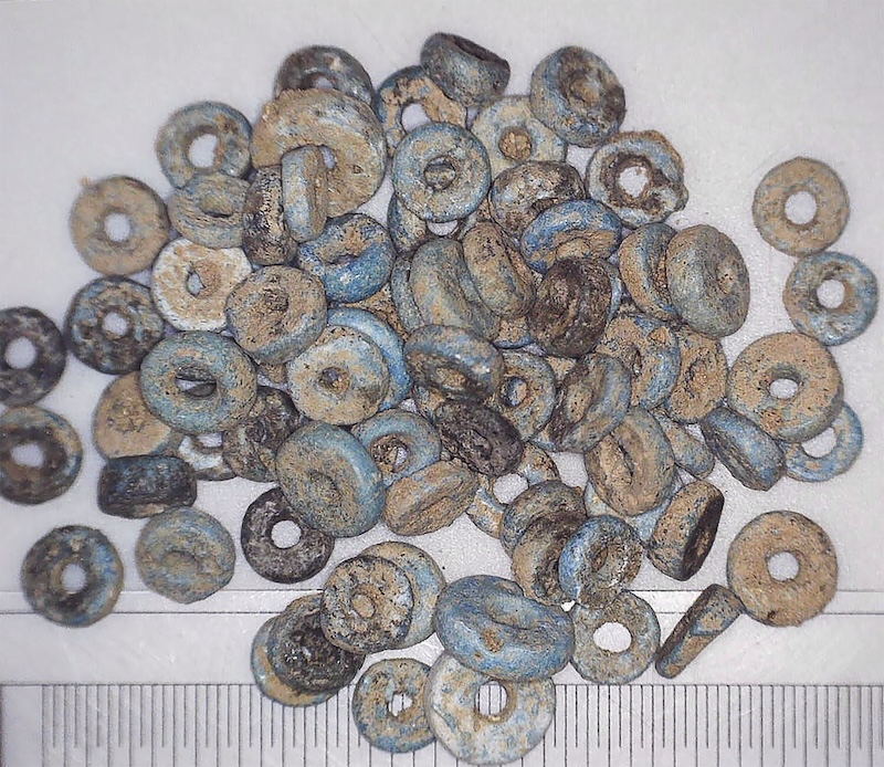 Arkeologlar, üstü oval bir toprak tümsekle örtülü mezarın içinde, bir erkek iskeleti, başının arkasına yerleştirilmiş iki çömlek kap ve boynunun etrafına dizilmiş 82 adet mavi sırlı seramik disk boncuk ortaya çıkardı.