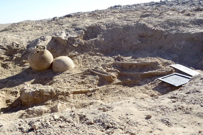 Mezarda, içinden kömürleşmiş bitki ve odun kalıntıları, hayvan kemikleri ve böcek parçaları çıkan bir pişmiş toprak kap bulundu. Ekip bunların, bir cenaze şöleninin artıklarını temsil ettiğini düşünüyor.