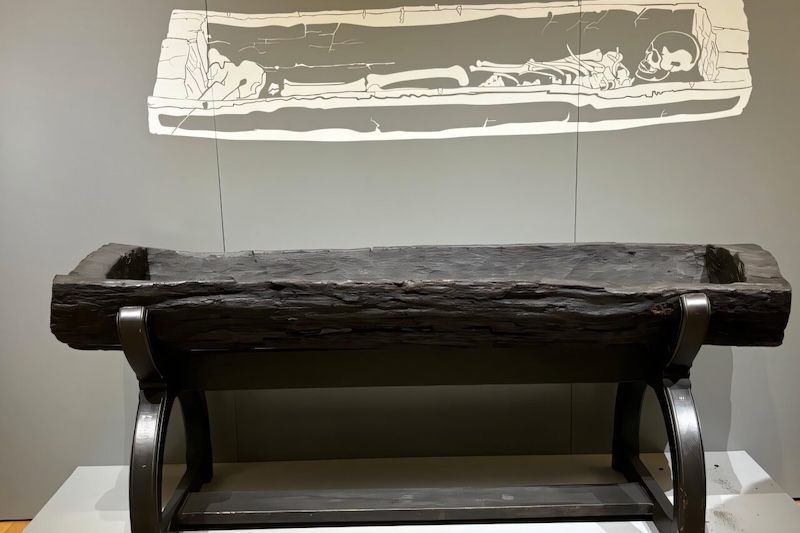 Kütük tabut, içine gömülen Roma dönemi “prensesinin” illüstrasyonu ile birlikte sergileniyor. C: Chmiel Chrzanowska et al. 2026.